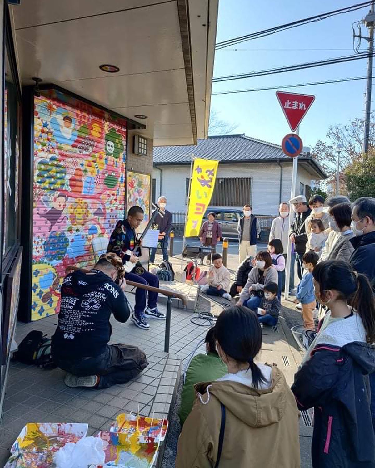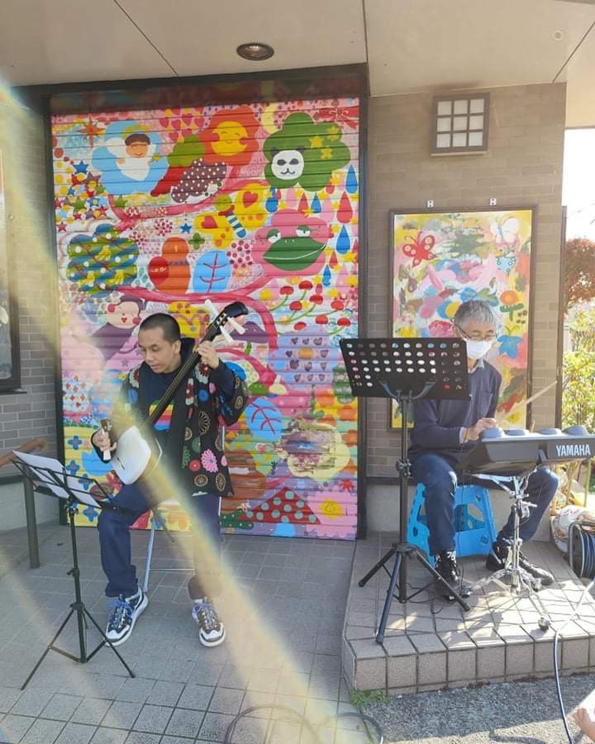 地元の画家であり友人のささきさとみ @sa.sa.sa がしらこばと橋近くの井上漢方堂のシャッターに技博の学人さん達と絵を描きまして、昨日その最後のサイン入れの日に演奏を頼まれて弾いてきました。