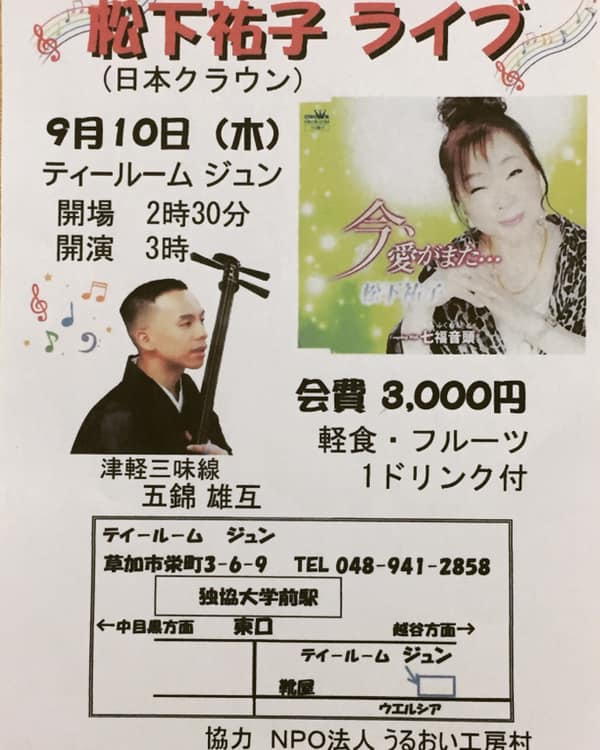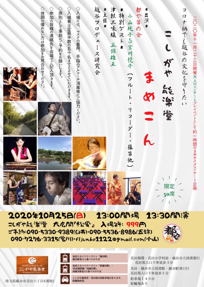 こしがや能楽堂大広間「松風」にて、10月25日(日)午後1時30分より、小山純子・宮川悦子・五錦雄互の3人での演奏会があります。
