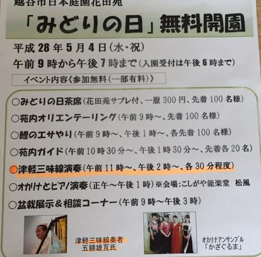 5月4日(水祝)みどりの日、越谷の日本庭園・花田苑公演。