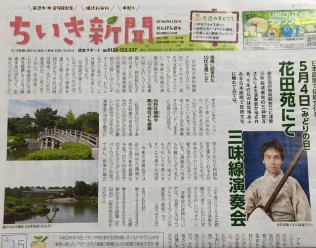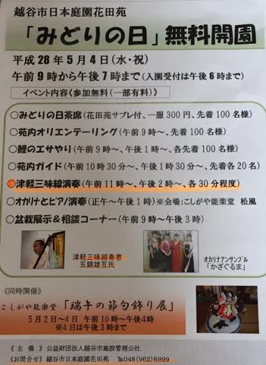 今年も5月4日(水祝)みどりの日、越谷の日本庭園・花田苑で弾かせて頂きます。