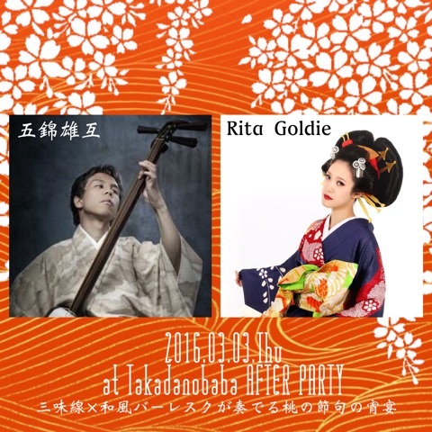 3月3日の雛祭り、高田馬場のサロン・アフターパーティにて、バーレスクダンサーのRITA GOLDIEさんとご一緒させて頂きます。