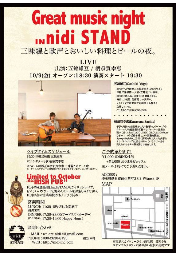 今日(金曜日)ですよ、越谷蒲生のワネストにあるカフェ、nidiSTANDライブ。
