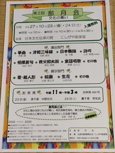 10月23日(金)24日(土)の2日間、越谷能楽堂にて、越谷の邦楽奏者の会「那月会」の公演があります。
