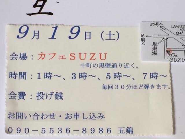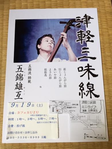 9月19日(土)八王子にて『越中八尾おわら風の舞in八王子』というお祭りがあるのですが、その日お祭りに出演する芸者さんたちの置屋などがある黒塀通りにある、カフェSUZUにて五錦雄互の投げ銭ライブがあります。