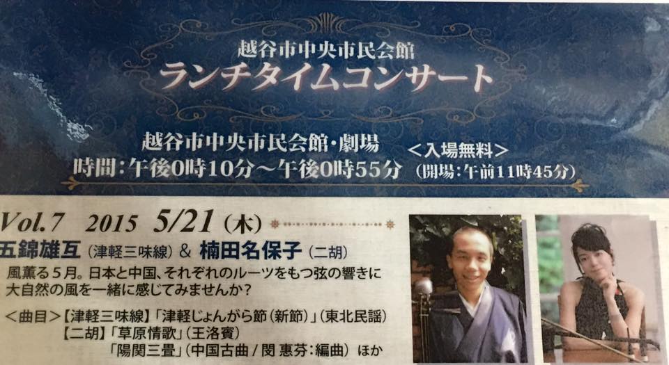 今週の木曜日、21日のお昼12時10分から、越谷市中央市民会館にて、二胡の楠田名保子さんとジョイントランチタイムコンサートがあります。