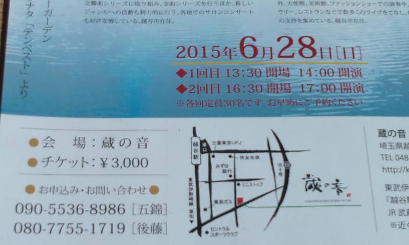 6月28日㈰午後2時~と午後5時~の2回、各回定員30名、蔵の音にて、
