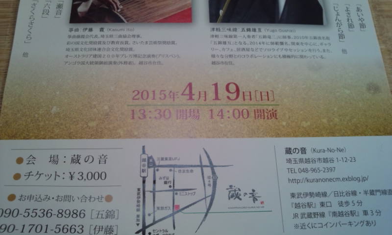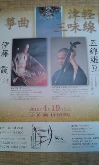 4月19日㈰午後2時から、越谷・蔵の音にて、筝曲の伊藤霞(かすみ)先生とジョイントライブをさせて頂きます。