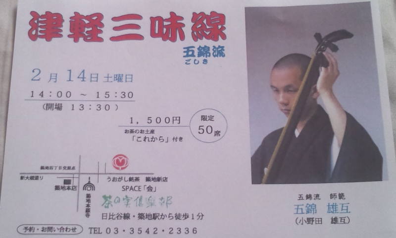 2月14日(土)バレンタインデー、午後2時より、 毎年させて頂いています築地・ うおがし銘茶・茶の実倶楽部(築地新店)にてソロライブがあります。