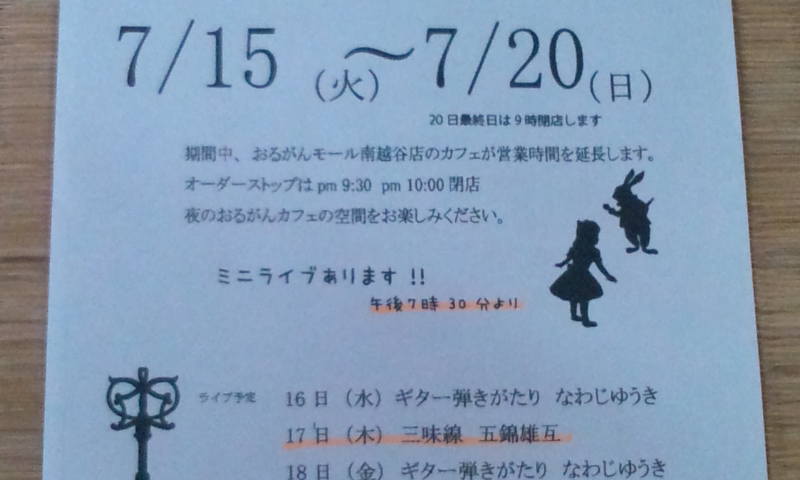 ところで来週木曜日、17日の午後7時30分から、南越谷ダイエー前のカフェ・おるがんモールにてちょっとしたライブをさせて頂きます。