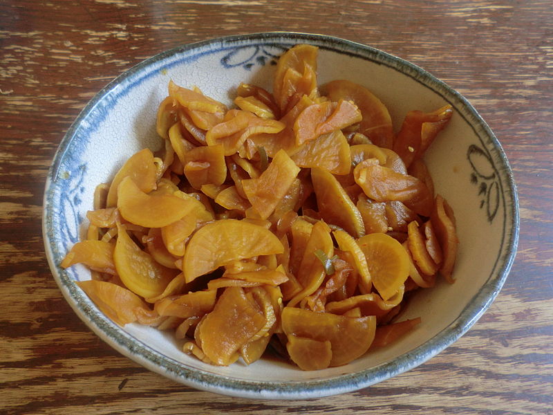 「18の時から36年通ってる人が言うには、以前は中身はー壺漬けーだったような気がするが今は黄色い普通の沢庵になったよ、とのこと。」