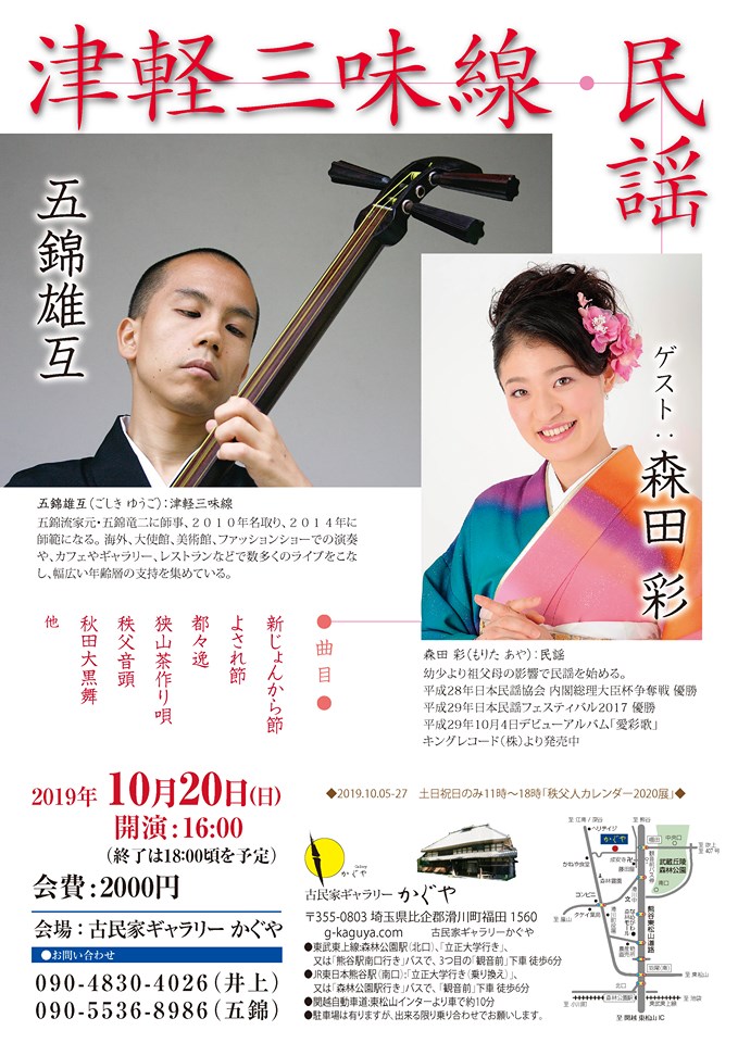 11月16日(土)午後3時から、本庄市のカフェ・NINOKURAにて、民謡の森田彩氏をゲストに招きライブをします。