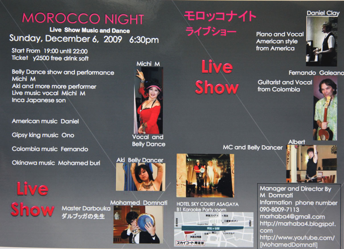 モロッコナイトです、急に決まったので出演時間など分かりませんが、どこかの時間に10分ほど弾きます。
