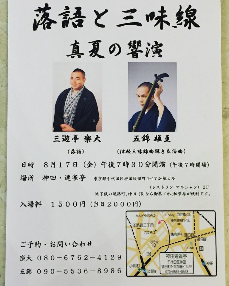 8月17日(金)午後7時30分開演より、神田・連雀亭にて、三遊亭楽大さんと2人会をさせて頂きます。
